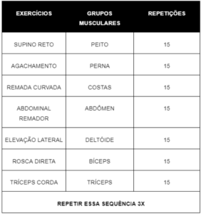Na tabela abaixo demonstro uma forma de organização do treino em circuito usando o modelo full body, ou seja, treinando o corpo todo em uma mesma sessão de treinamento. Entre os exercícios não terá descanso, ou caso haja necessidade, um descanso mínimo. Ao acabar todos os exercícios em sequência, fez-se uma série. No exemplo abaixo utilizaremos 3 séries.